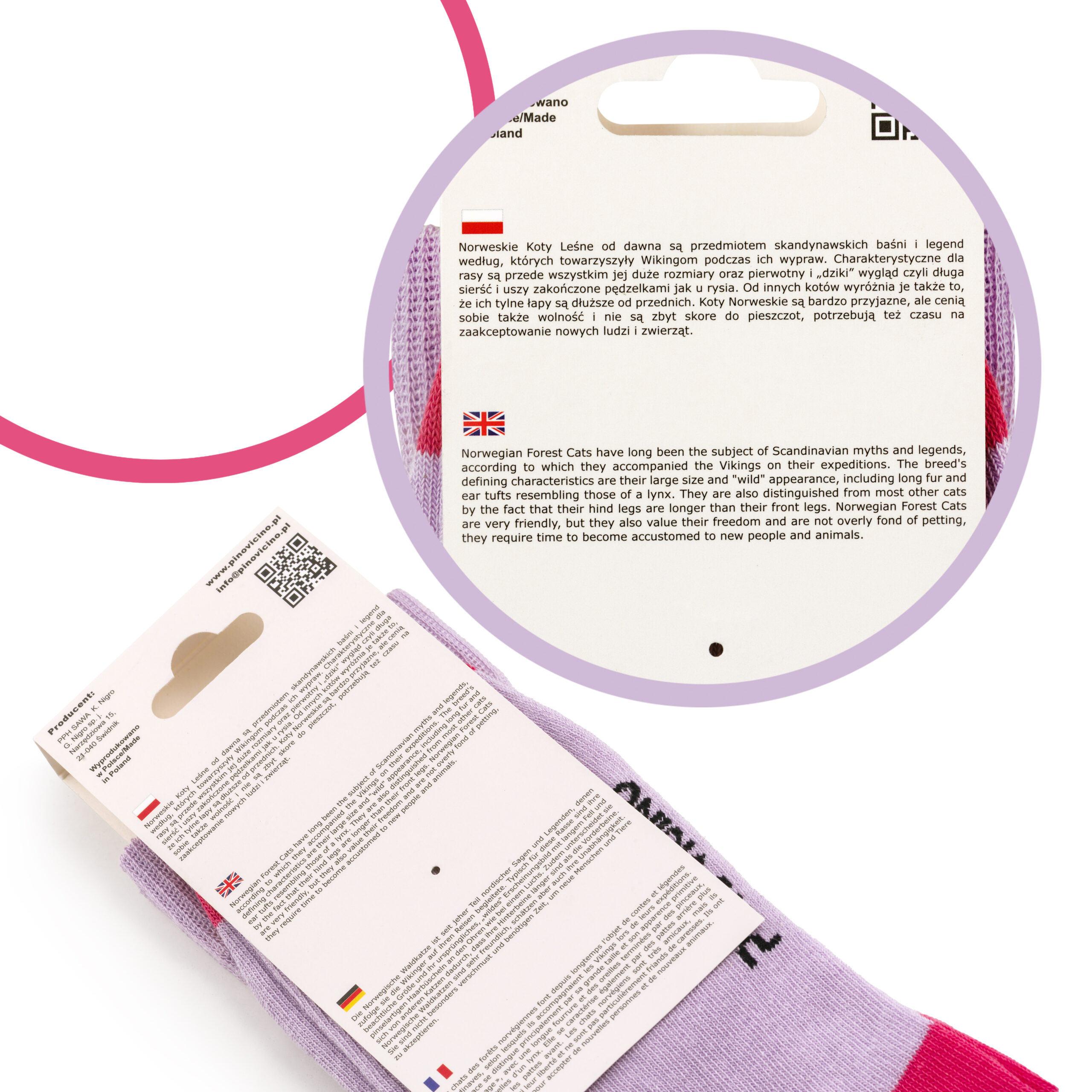 Norweski Kot Leśny to rasa o imponującej sylwetce i gęstej, puszystej sierści, przystosowanej do surowego klimatu. Niezależny, czujny, a jednocześnie lojalny wobec swojego opiekuna – łączy w sobie dzikość natury i domowe ciepło. Motyw tej rasy nadaje skarpetkom wyrazisty, elegancki charakter.