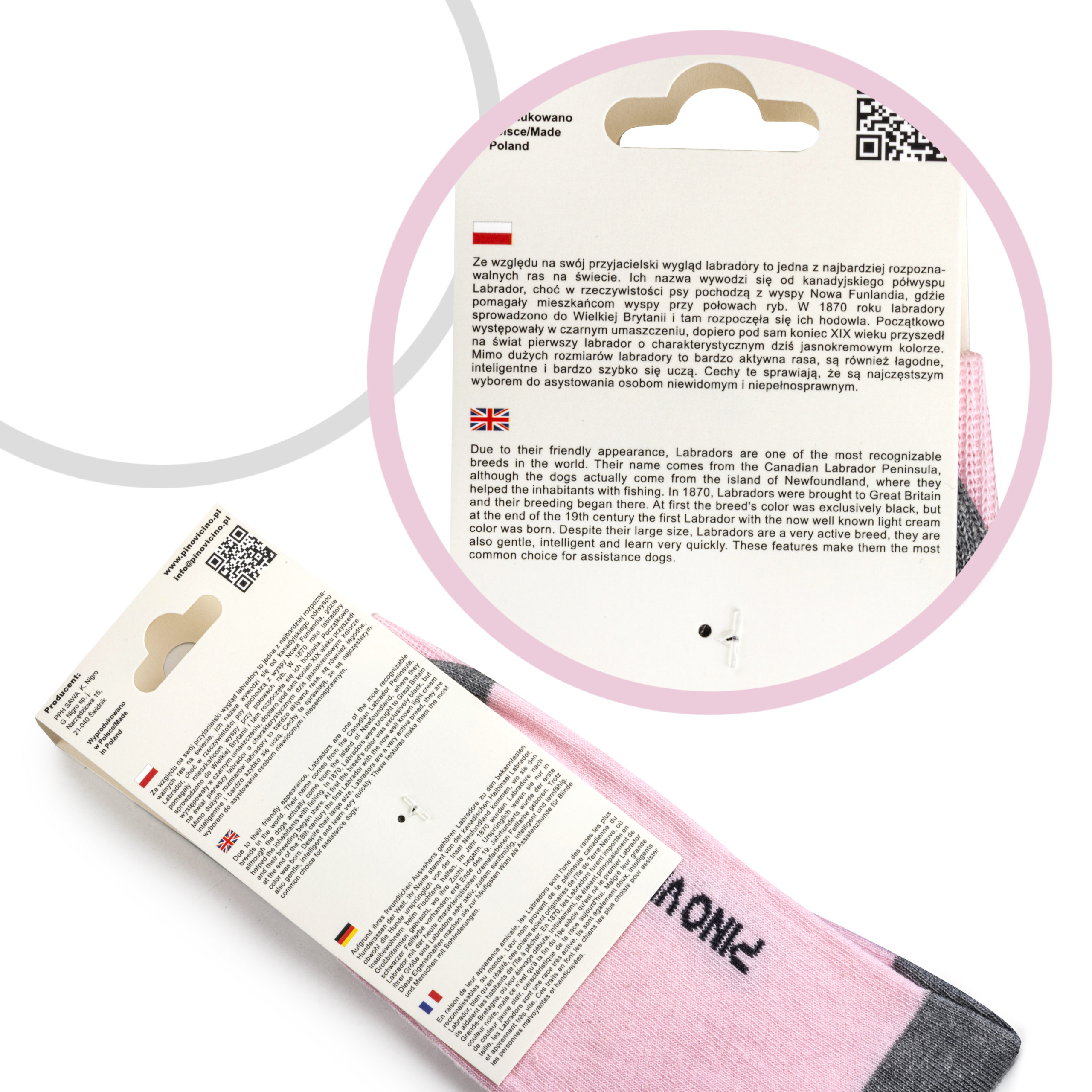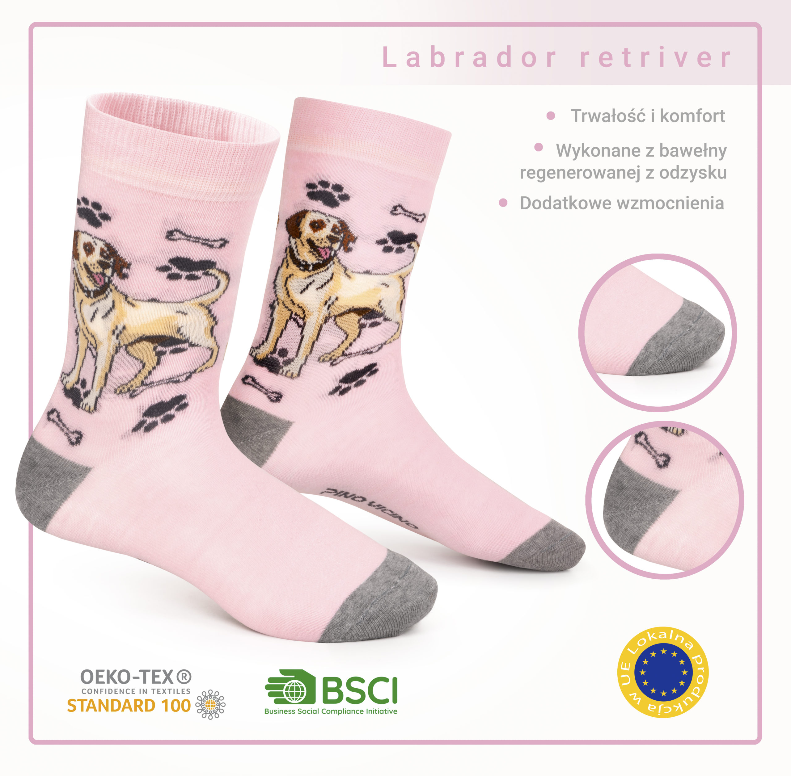 Kolorowe skarpetki z motywem Labradora. Polska produkcja, OEKO TEX 100, wygodne i trwałe.